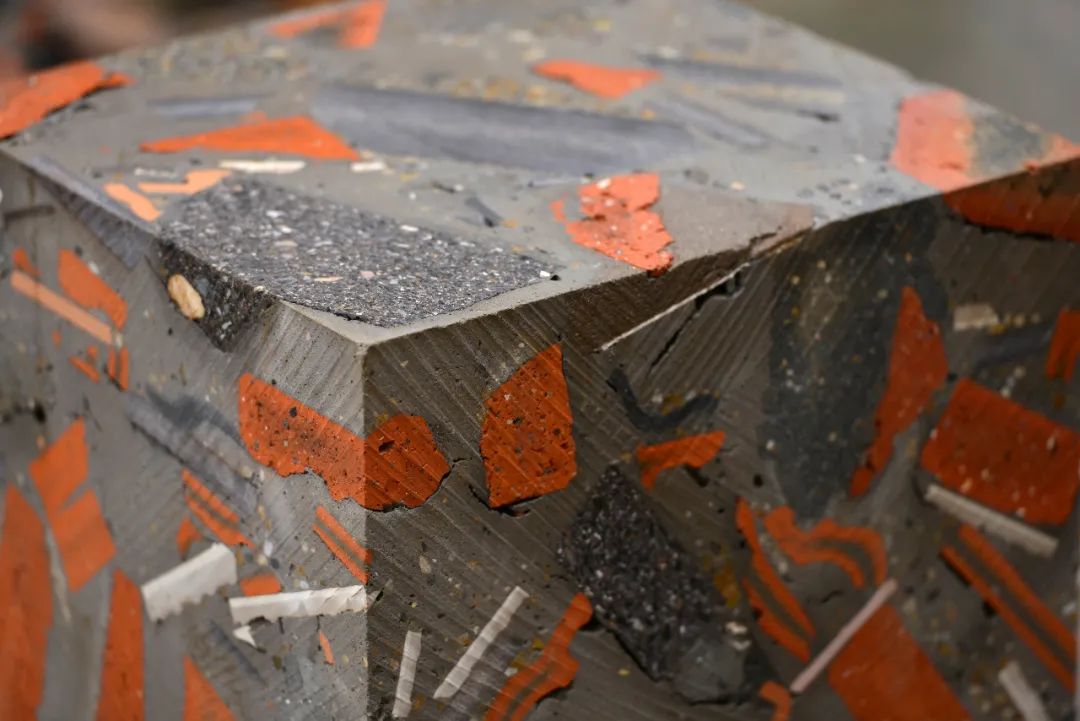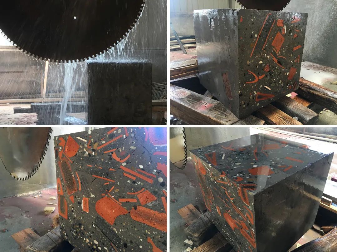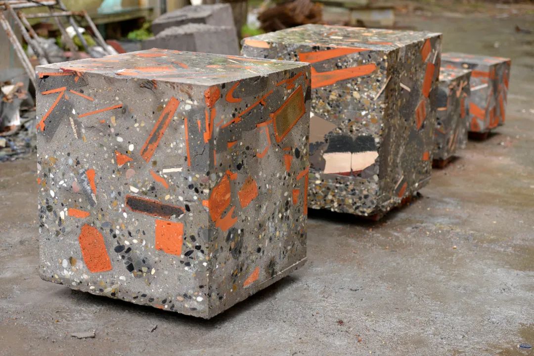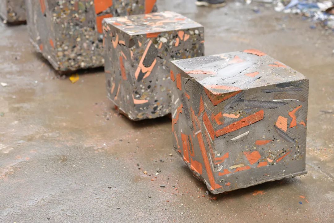 作品的具体实施步骤是:首先,在各户已拆迁的建筑废墟中采集能代表这处废墟特点的建筑及装饰材料,并查明房屋所在的街巷及户主姓名,确定其GPS定位点。然后,将建筑废料用水泥封存成一定尺寸的立方体,使其完全干透硬化。接着,再用对立方体的各个面进行切割,这样内部的各种材料就显现出来了。最后一道工序是将采集到的住户信息雕刻在封存体上,每个封存体与原来的街区空间定位产生了对应关系。