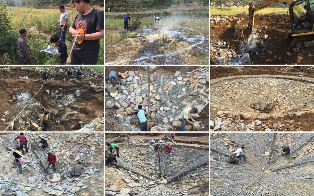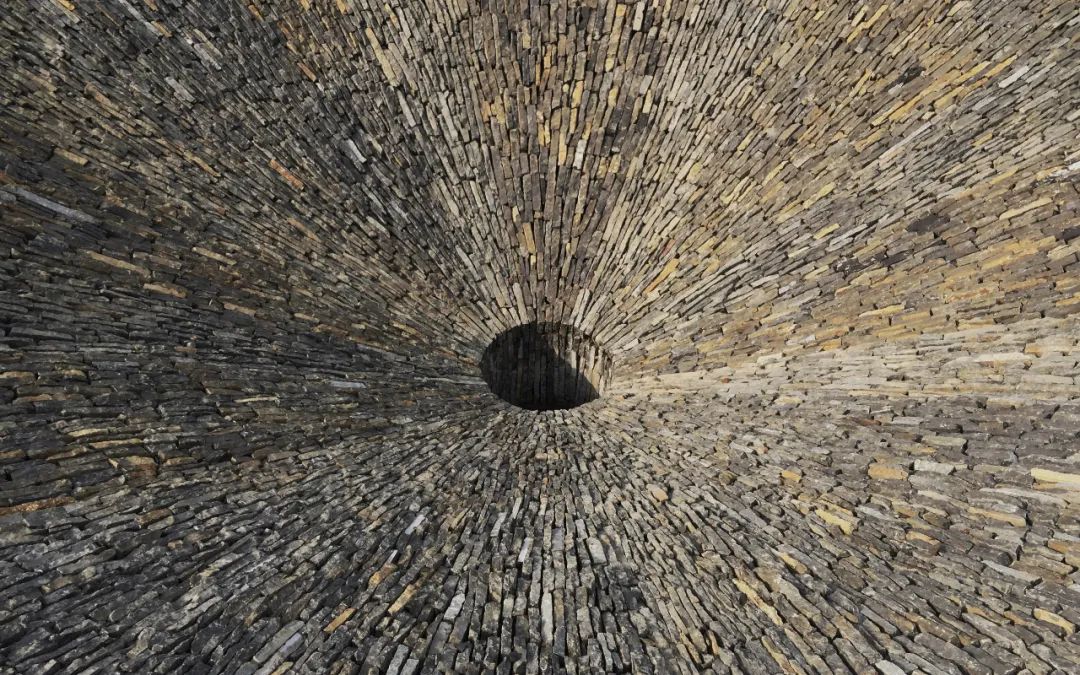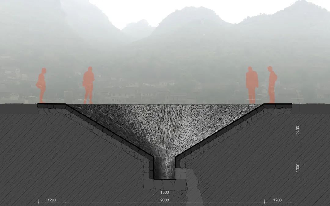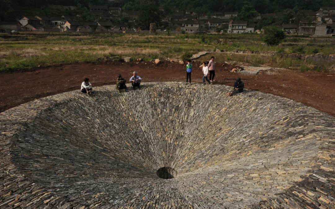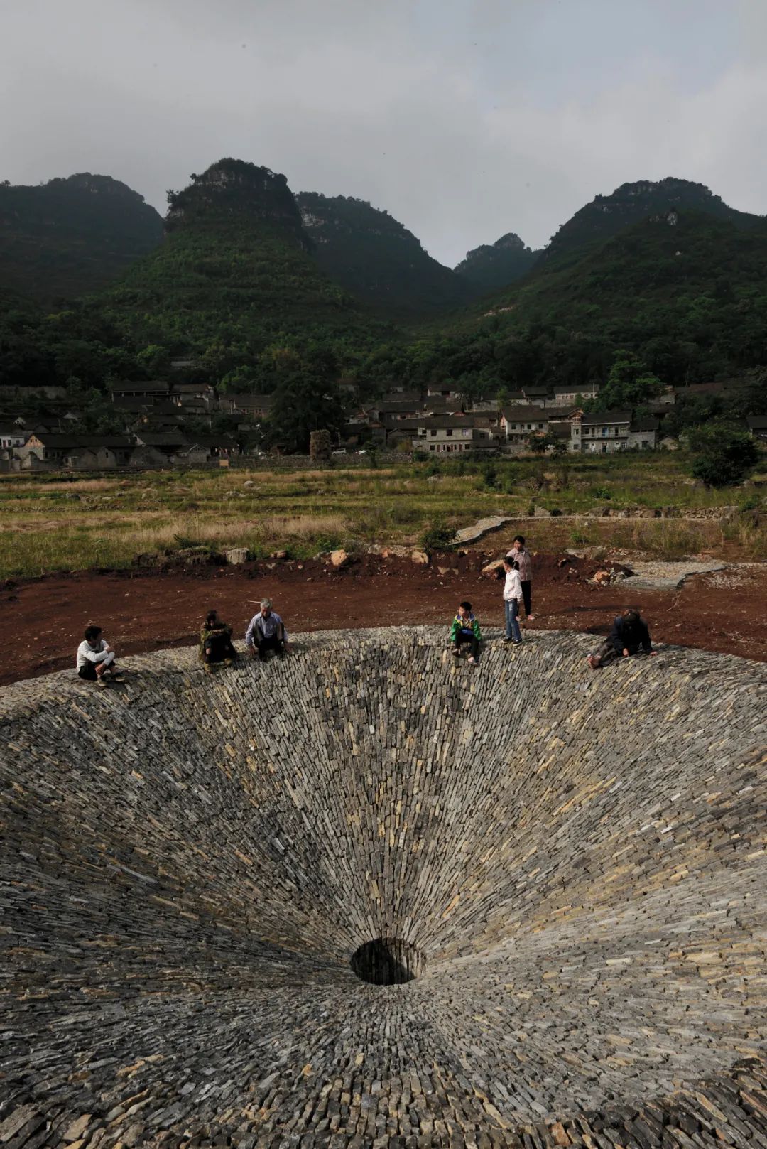 《天坑地漏》这件作品的创作意图在于采用一放大的“漏斗”来强化场域的地质特点和历史记忆。《天坑地漏》的空间形态采用了漏斗形,“漏斗”上沿直径为9米,深度为2.4米,下沿开口直径为1米,下沿洞口深度为1米,在最底部侧壁预留了直径为30厘米的洞口排水,这个洞口直通地下暗河,如遇到暴雨极端天气,地漏会显现出更好的排水功能。“漏斗”壁采用当地页岩呈放射状铺砌,密集的放射线向洞底汇集,营造出强烈的吸入感。“漏斗”底部的黑洞似乎充满神秘的力量和危险性,好奇心会促使人想走到底部一探究竟。