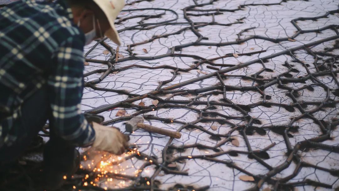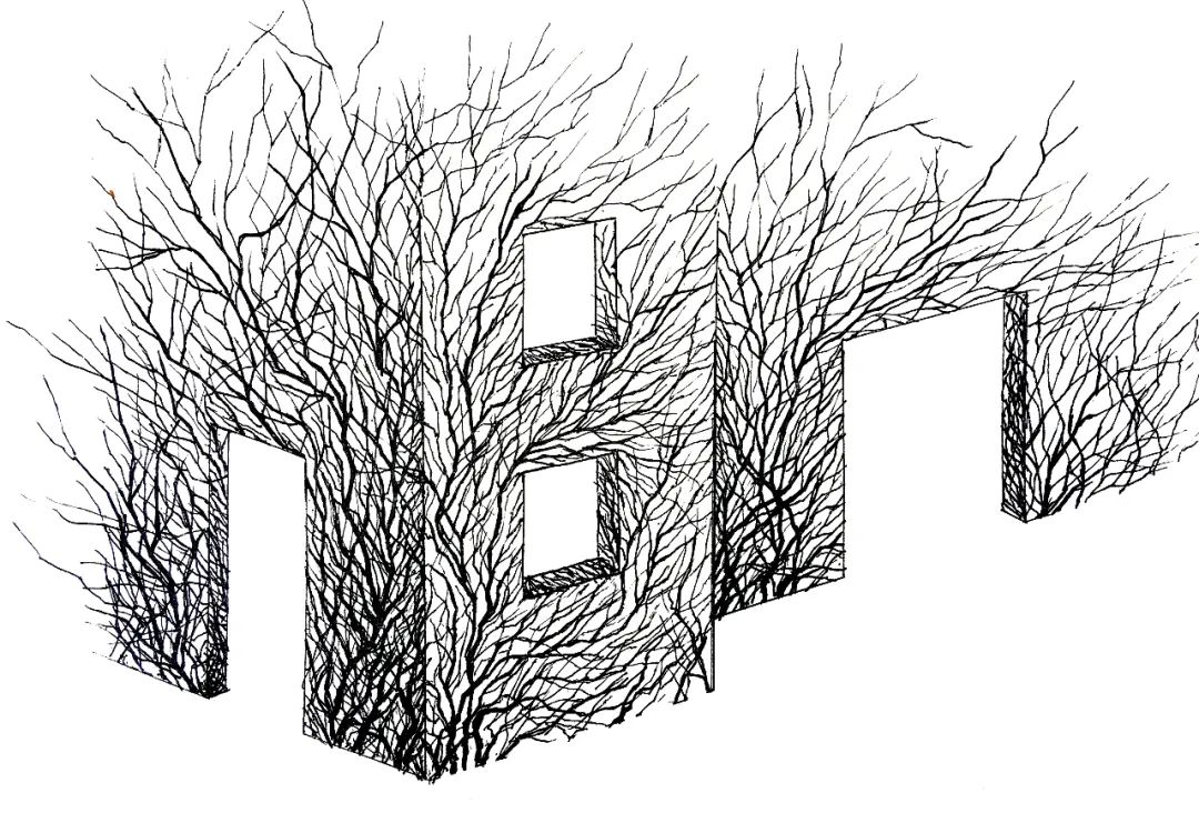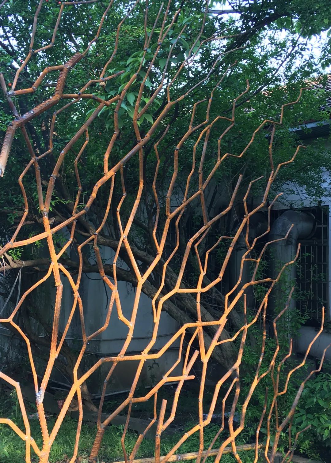 在江南棚户区随处可见爬满爬山虎的房子,这种景象体现了人与自然的和谐共处,也构成人通常对于家园的记忆。爬山虎依附在建筑上生长时的同时,也忠实的塑造出了建筑空间形体转折与围合。《爬山虎的家》这件作品通过“抽离“爬山虎所依附的建筑物,仅留下盘根错节带有建筑形体空间记忆的爬山虎。作品的尺度以棚户区旧房子的实际尺寸为依据,材料采用拆迁现场废弃的钢筋銲接,整体营造出爬山虎对房子的包裹状态,形成通透虚空的形体。