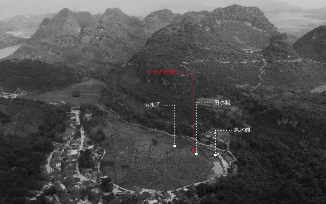 《天坑地漏》是件与独特地质特点相关联的地景艺术作品,作品的创作地点在中国西南部的乡村——雨补鲁寨。雨补鲁寨是贵州省黔西南布依族苗族自治州兴义市清水河镇的一个自然村落,距兴义市区20公里,是黔西南州的一处“世外桃源”。雨补鲁所在区域属于典型的喀什特地貌,这个寨子建在一个天坑里,相对落差达610米,天坑呈喇叭花形,大量的百年建筑在这个寨子里被完好地保存了下来,有的房子甚至没有深挖基础,建在了原生的石板上。村周边土地肥沃,树木繁茂,期间良田、山泉、石屋、古树、老井、溶洞、修竹、古河道、古营盘和茶马古道等相映成趣,和谐而自然的构筑出环抱在群山中的这片世外桃源。