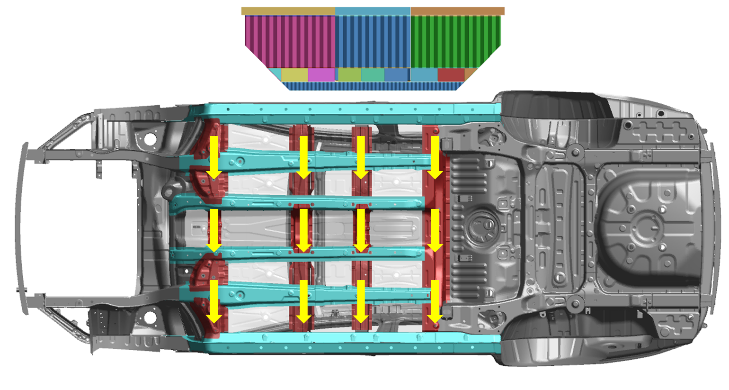 - 碰撞后B柱外侧及下槛:B柱、车门防撞梁、门槛、B柱上边梁等结构都采用了超高强度热成型钢,形成了坚固的笼式车身结构,通过刚度匹配设计,B柱中间位置通过加强件进行加强、B柱下端(非假人区域)进行更多的变形吸能,使得车门结构变形呈现S形状,减小乘员区域的侵入。
