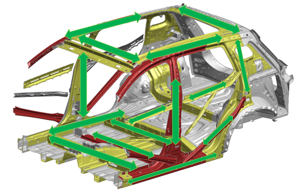 - 前纵梁上侧与外侧及前保骨架:处于有效吸能状态,车身正面结构综合吸能、导力技术设计的发动机舱结构,采用较大截面尺寸的纵梁,具有稳定的冲击承载能力,可使发动机舱结构在受到前部撞击时稳定有序地溃缩吸能,从而最大限度地由发动机舱吸收碰撞能量,控制传递到乘员舱的碰撞能量。