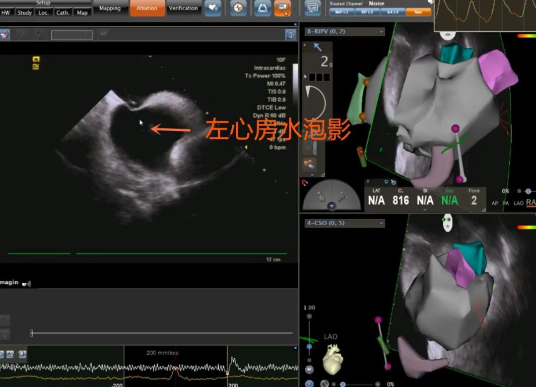 穿刺针通过房间隔后,注水超声下左心房水泡影,证实成功