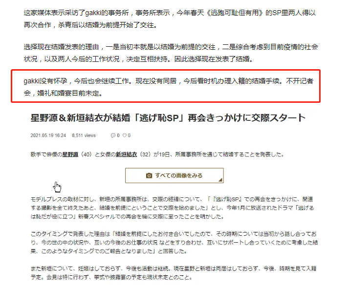 此外,新垣结衣事务所还表示,虽然已结婚但新垣结衣未入籍,未同居,未怀孕,婚礼和婚宴也是未定状态。