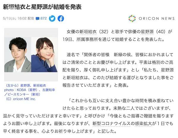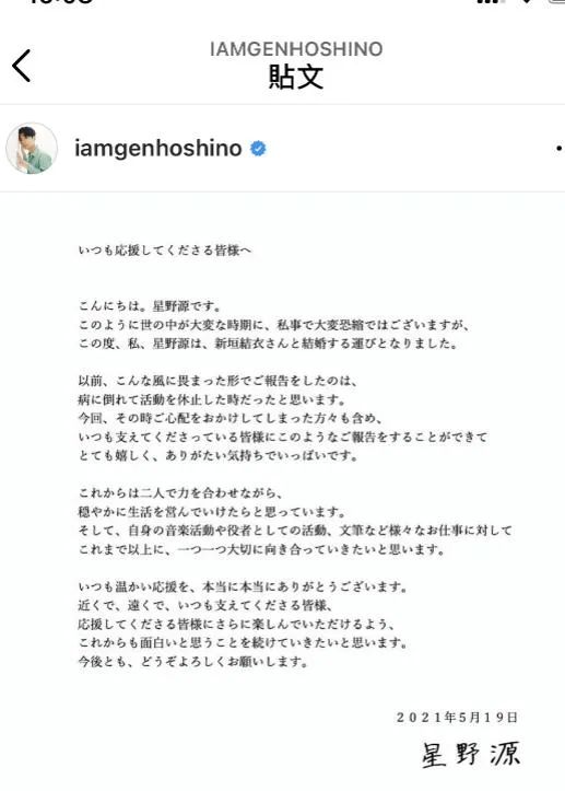 星野源在社交帐号上发布了二人联名声明,声明中表示,今后两人会相互扶持、慢慢积累,“虽然我们两个人还不成熟,但很荣幸能得到大家温暖的支持,希望大家今后也能继续鞭策我们。最后,衷心祈愿新冠疫情能尽早结束。”