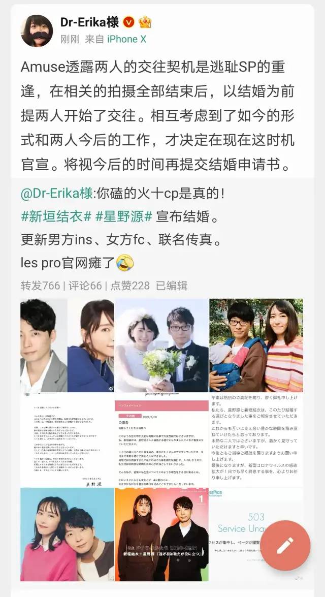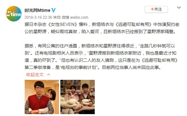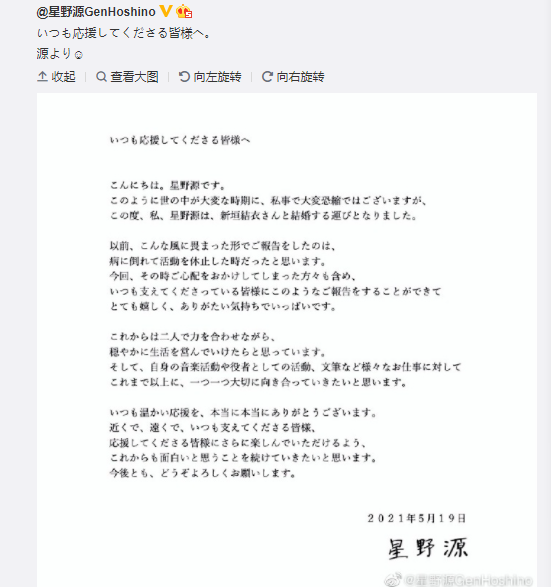 也许预料到无数中国网友会跳起来向他喊话“还我老婆”“夺妻之仇不共戴天”,星野源还特地发了一份微博声明。这个叫什么,叫宣誓主权?