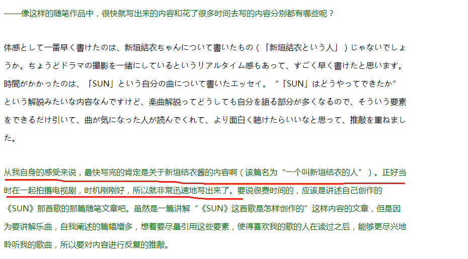 有记者曾采访星野源,问,这样的随笔作品,很快就写出来的内容有哪些,“从我自身的感受来说,肯定是关于新垣结衣,因为正好当时在一起拍摄电视剧,时机刚刚好。”