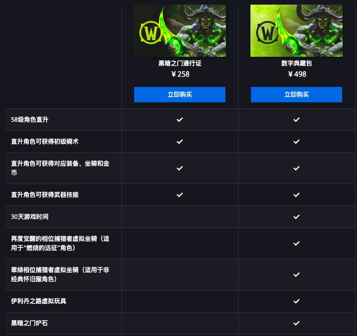 通行证需要258,仅仅是角色直升一项;典藏包498,包含直升、月卡、正式服怀旧服双坐骑、黑门炉石、一个冷却15min的玩具伊利丹之路。并且每个号只能直升一个角色,血精灵和德莱尼不在此列。随着前夕开放,未来魔兽世界TBC怀旧服的角色复制为98、转服120、时光变成了90。