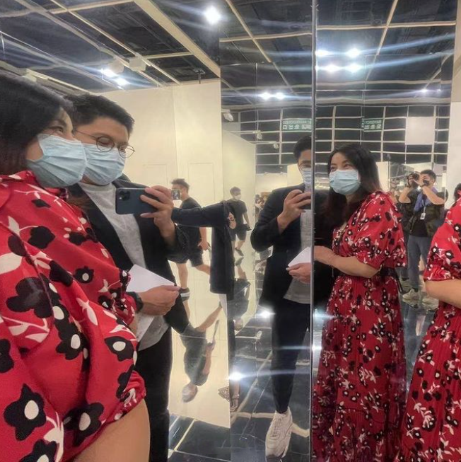 画面中郭晶晶身穿一大红色长裙,上面配有黑白相间的花朵,与“520”的节日氛围十分应景。镜子中反射出的两人合照,郭晶晶亲密挽手霍启刚,露出迷人微笑,虽然眼袋十分明显,但自然美丽仍显清秀优雅。
