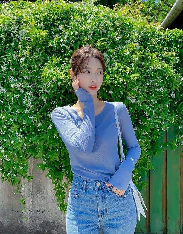 这一套针织衫穿搭真的很值得借鉴,薄款的蓝色针织衫,既性感吸晴又能恰到好处的提高腰线比例,一举两得。简简单单的款式,上身有些肉肉的女生都能驾驭!下装配上一条高腰牛仔拖地裤,让你的双腿瞬间拉长,咋一看就有种“腰下全是腿”的既视感。