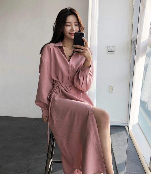 这个藕色衬衫裙是比较显气质的服饰,长款衬衫裙穿出来特别温柔,搭配一双米白色方跟鞋,高挑又很显知性气质。