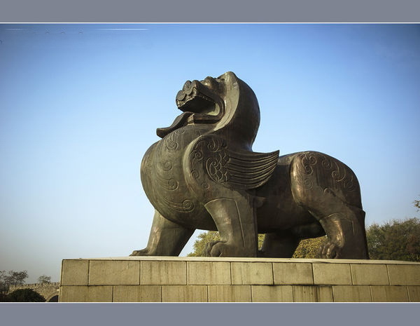 “辟邪神兽”,似麒麟而无角,两侧有翼,肌丰骨劲。南朝辟邪石刻最为有名,南京的辟邪很多就是南朝的遗存,作为南京的形象就是矫悍威猛镇灾祛恶的辟邪。