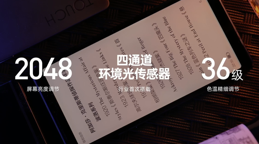 海信 Touch 音乐阅读器搭载了 5.84 英寸黑白水墨屏,边框宽度为 4.52mm,配备双色温阅读灯,为行业首次搭载四通道环境光传感器,屏幕亮度支持 2048 级调节,屏幕色温支持 36 级调节。
