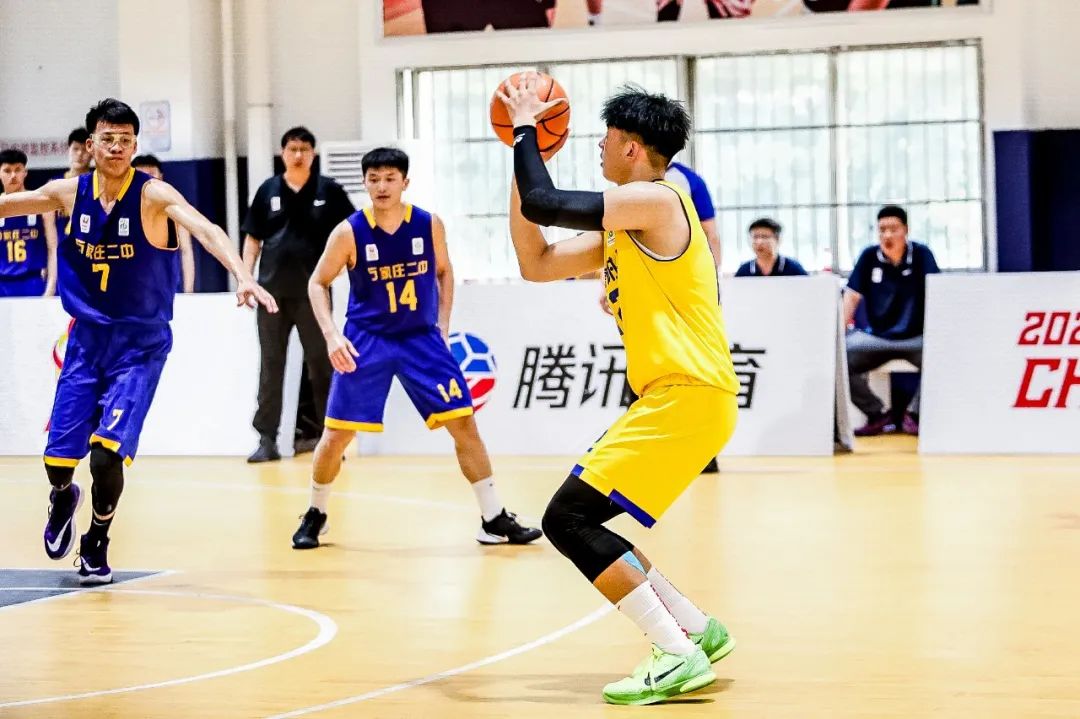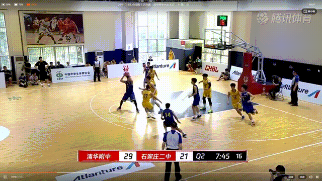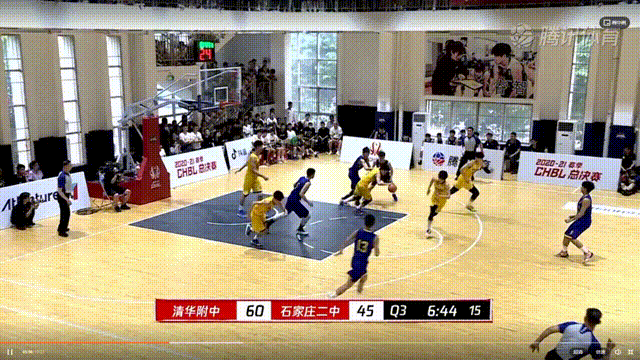 随后石家庄二中14号王乙丞面对清华附中多位内线防守,做出上下步避开协防威胁,完成上篮得分。