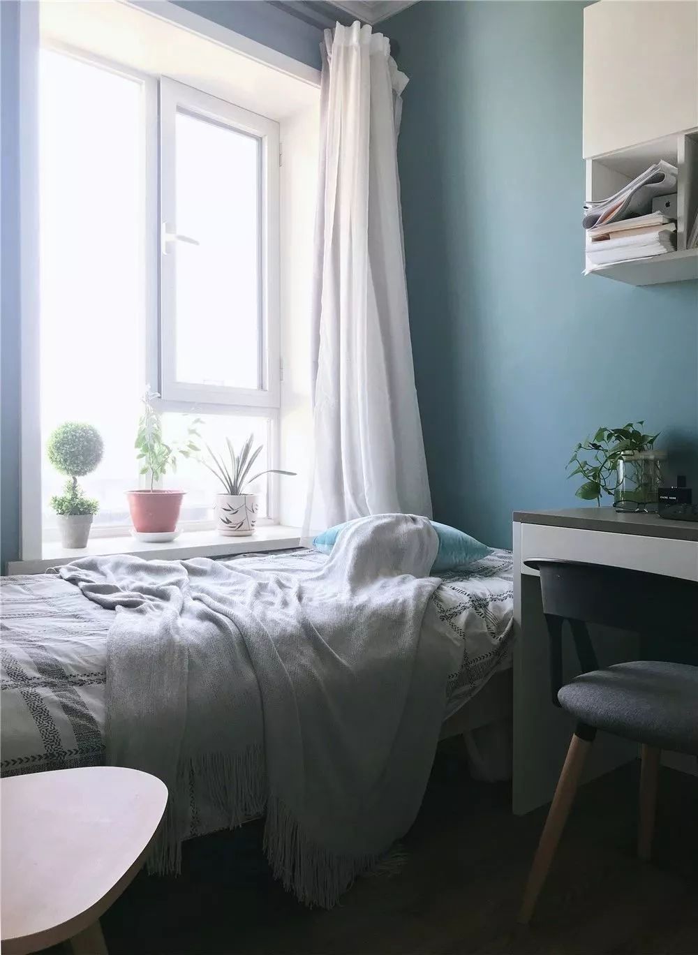次卧的床选择了靠着窗户摆放,留出更多的面积来做书桌和衣柜,同样在窗台上摆放一些绿植,多出了一抹绿色会更加惬意、舒适一些。
