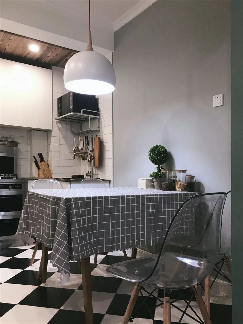 餐厨的地面铺贴了黑白色的地砖,构造了现代时尚的感觉。选择透明的餐椅,也让这个空间看起来更加通透。厨房的墙面空间做了不少的收纳设计。