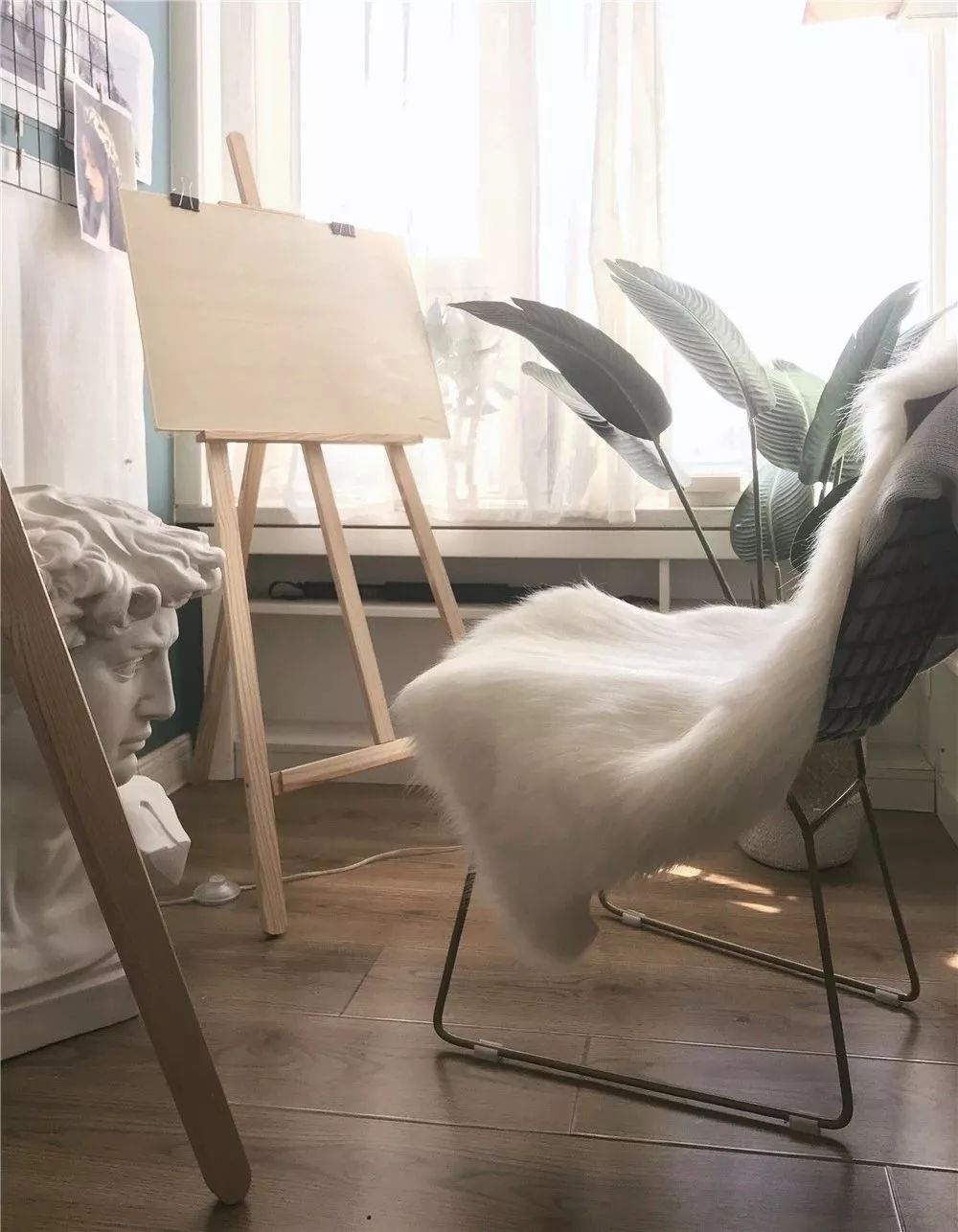 在次卧的门外是一个休闲、工作区,屋主在这里摆放了艺术品、椅子和画架、绿植、照片墙等等,让这个小空间充满了文艺感。