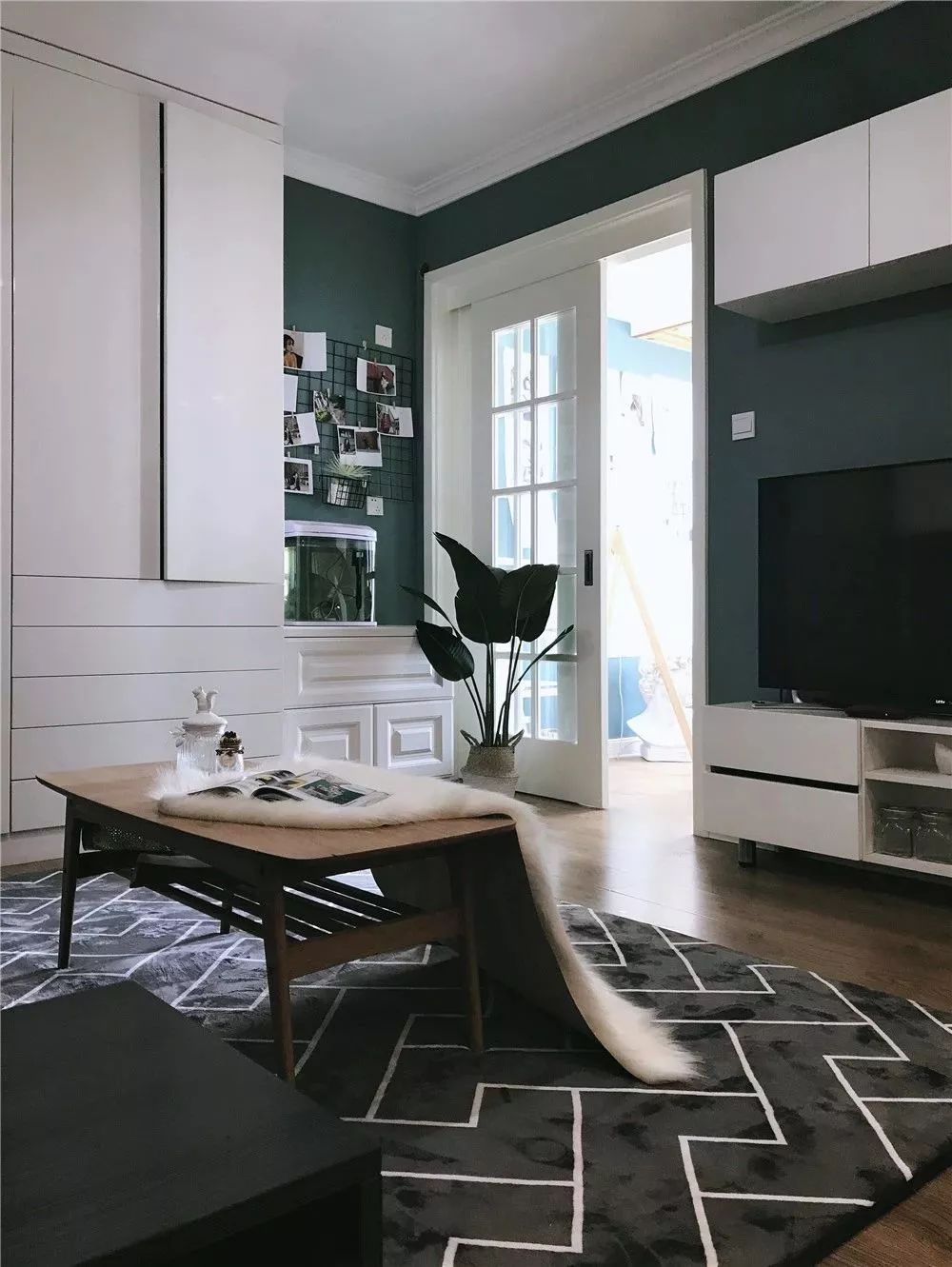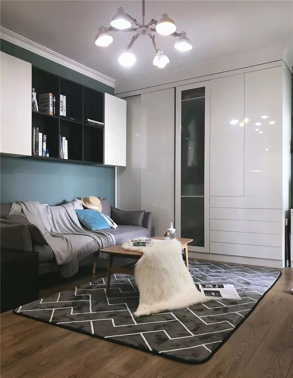 整个客厅的柜子以白色为主,搭配复古色调的背景墙,显得更有格调感一些。这个舒适的地毯、毛毯摆设等,也让客厅多出一些轻奢感。
