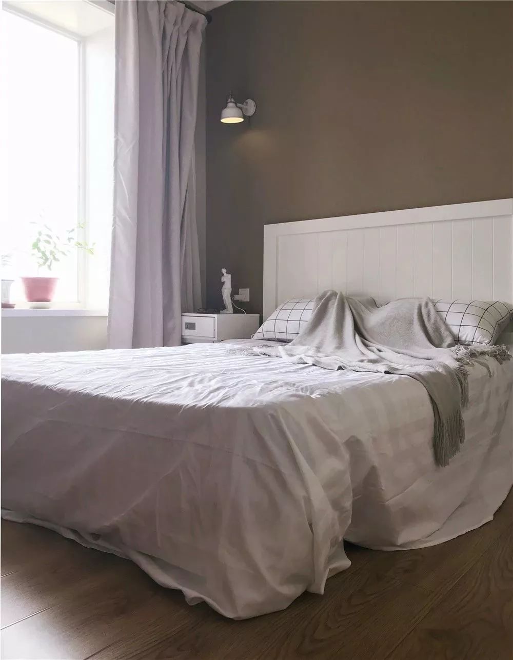 主卧室的墙面被刷成了浅咖灰色,搭配白色的床和床品,看起来简单而又舒适。卧室内的窗台摆放一些绿植,给卧室增添一些自然感。