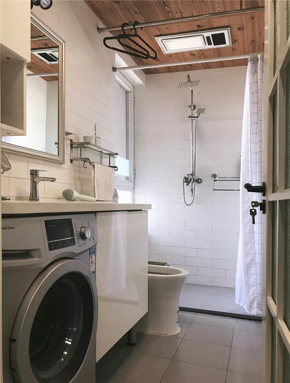 卫生间的空间是比较宽敞的,一字形排列的洗手台、马桶和淋浴区,洗衣机也被放在了洗手台的下方,浴帘搭配挡水条可以保证卫生间的干湿分离效果。