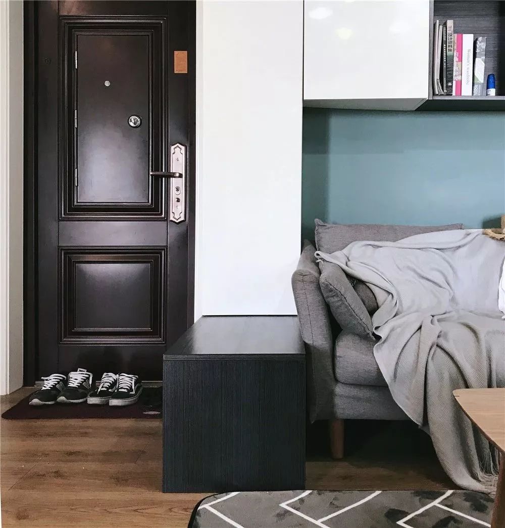 入户没有玄关走廊的户型,设计师在入户门的侧方做上一个换鞋凳,底部可以摆放日常更换的鞋子,和客厅之间打通,让整个空间更加宽敞。
