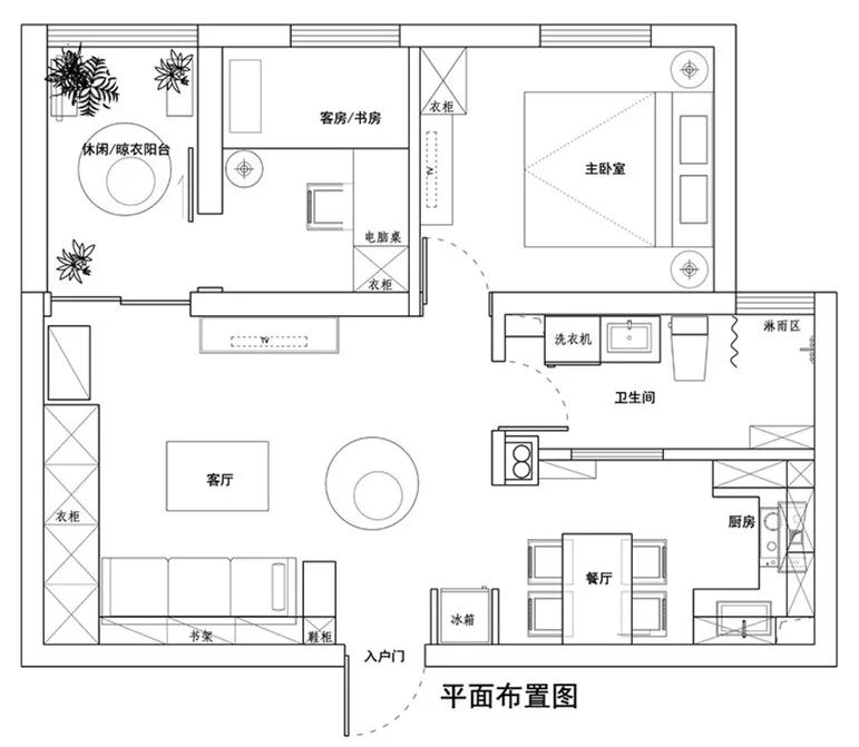 在入户门的另一侧是餐厅和厨房空间,冰箱被放在了转角的地方,做了嵌入式的设计。餐桌椅靠着墙面摆放,整体布置紧凑而又实用。