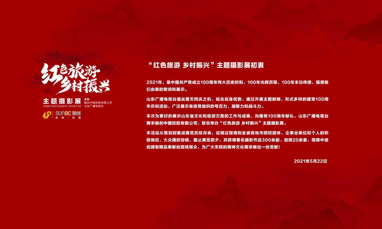 “红色旅游 乡村振兴”主题摄影展是在山东省文化和旅游厅指导下,由山东电视农科频道、山东电视生活频道,融创中国控股有限公司共同主办,旨在传承红色基因、弘扬革命文化、凝聚奋进力量、助力乡村振兴。
