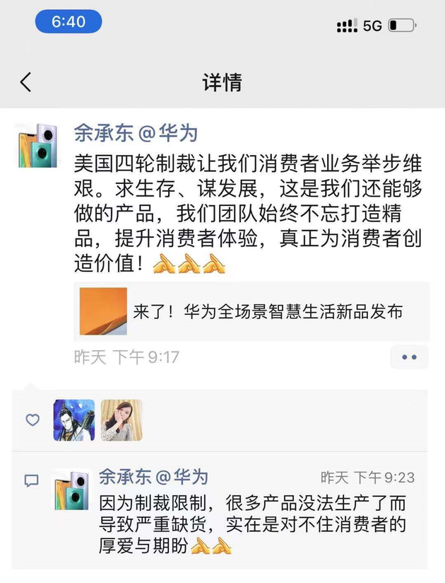 近日,华为消费者业务总裁余承东在朋友圈表示:“美国四轮制裁让我们消费者业务举步维艰。求生存、谋发展,这是我们还能够做的产品,我们团队始终不忘打造精品,提升消费者体验,真正为消费者创造价值!因为制裁限制,很多产品没法生产了而导致严重缺货,实在是对不住消费者的厚爱与期盼”。(新浪科技)
