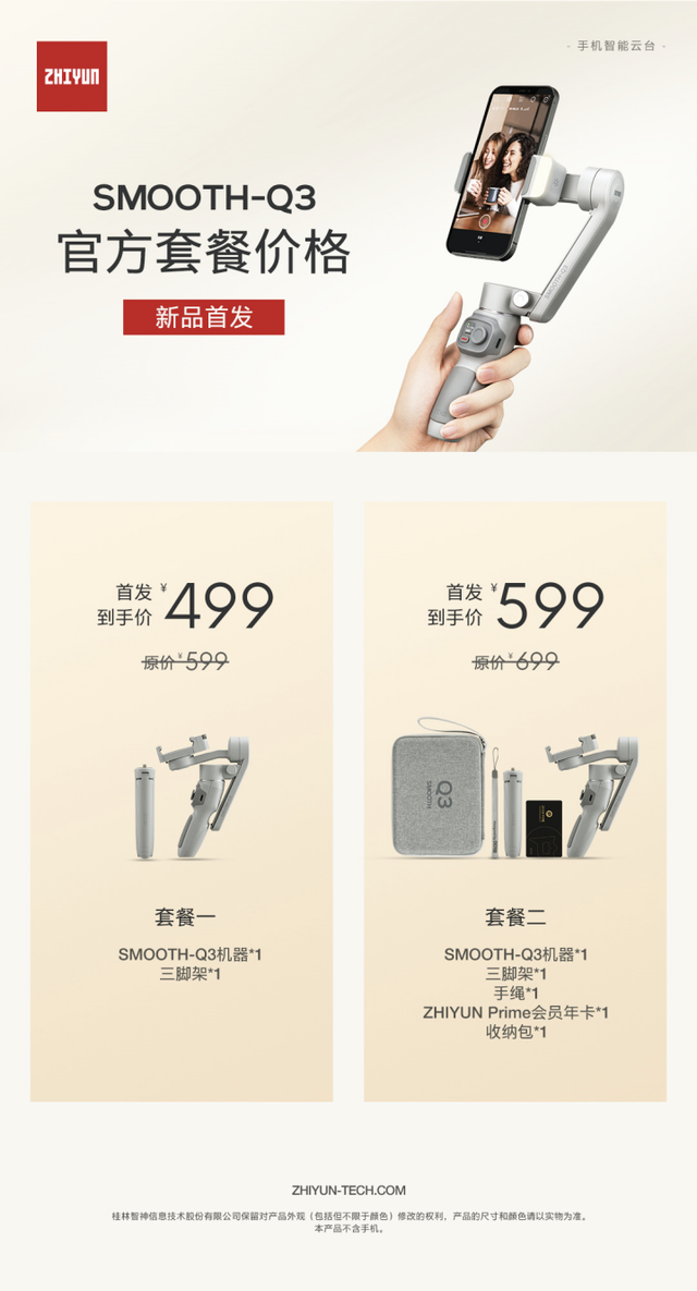 智云 SMOOTH-Q3 拥有两个套餐,标准版套餐拥有 SMOOTH-Q3 和三脚架,另外的套装则加入了手绳、会员年卡和收纳包,用户可随时选择自己喜欢的套餐购买,想不想做短视频赚钱?这个神器你一定不能缺少。