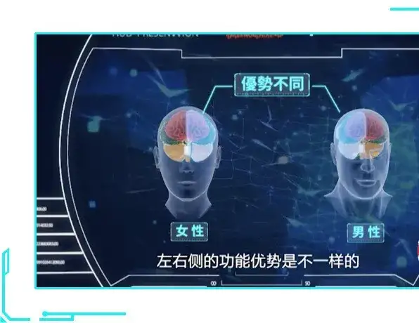 左侧大脑主要掌管语言方面,右侧大脑主要掌管空间定位。男女的大脑半球的优势侧不相同,女性的优势半球普遍在掌管语言方面的左侧大脑,男性的优势半球普遍在右侧大脑。