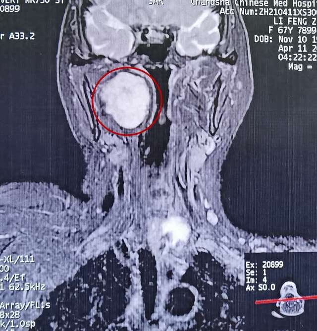 今年65岁的刘翠(化名)在几年前咽部就间断开始出现不适,她以为是慢性咽炎,就没太在意,直到近一个月来出现声音嘶哑、言语含糊不清、吞咽障碍、张口受限等情况才辗转到省城医院就诊,经检查发现她的右侧咽旁间隙颅底区有如鸡蛋般大小的肿瘤,这类发于咽旁间隙的肿瘤比较罕见,仅占头颈部肿瘤的0.5%。