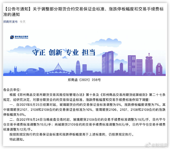 【郑商所:调整部分期货合约交易保证金标准、涨跌停板幅度和交易手续费标准】5月21日,郑商所发布通知,自2021年5月25日结算时起,玻璃期货合约的交易保证金标准调整为9%,涨跌停板幅度调整为7%。其中玻璃期货2107、2108和2109合约的交易保证金标准为10%,玻璃期货2106、2107、2108和2109合约的涨跌停板幅度为8%。