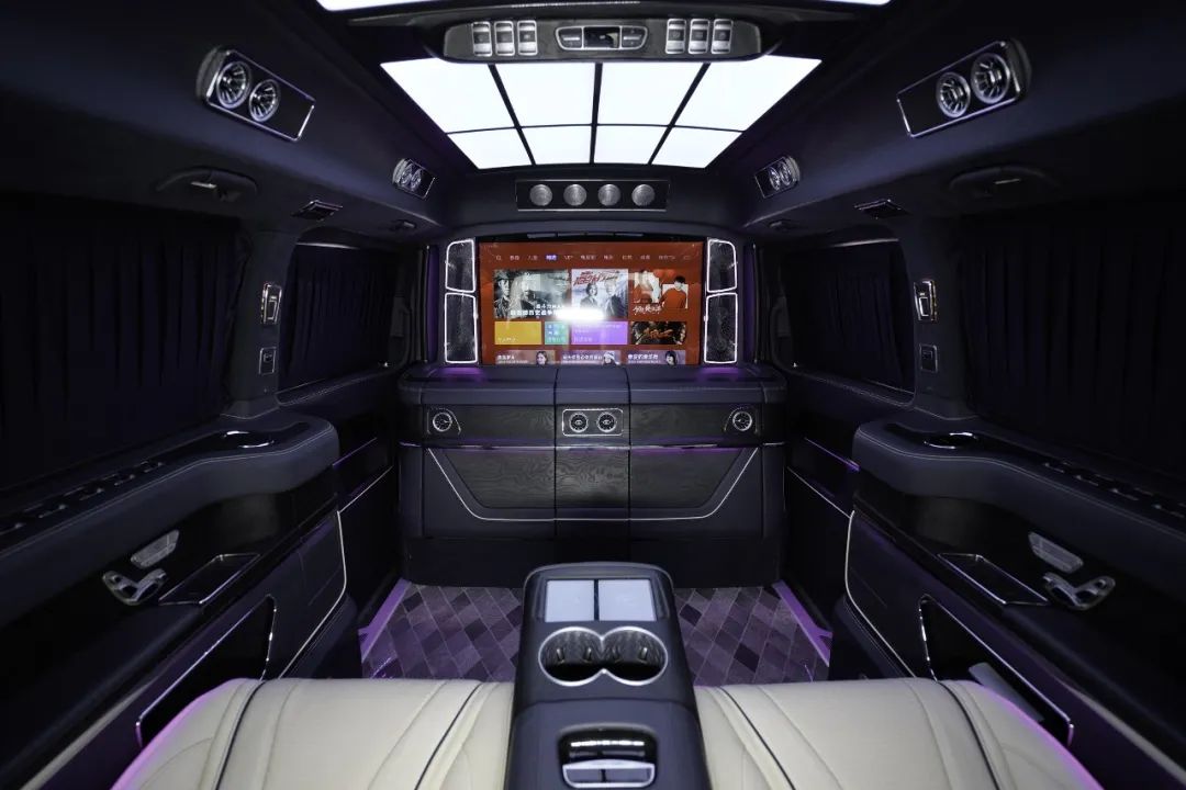 克蒂圣姆峰的氛围感,或许你会因为舒适的第二排,忘记了周围的环境,而当你的目光向前排望去,才会发现克蒂圣姆峰的氛围营造,也很无敌。吧台折叠座椅可以隐藏,和46英寸的升降电视共同构成隔断。这台MPV车型上,它依然能呈现出同级其它车型无可比拟的豪华感。