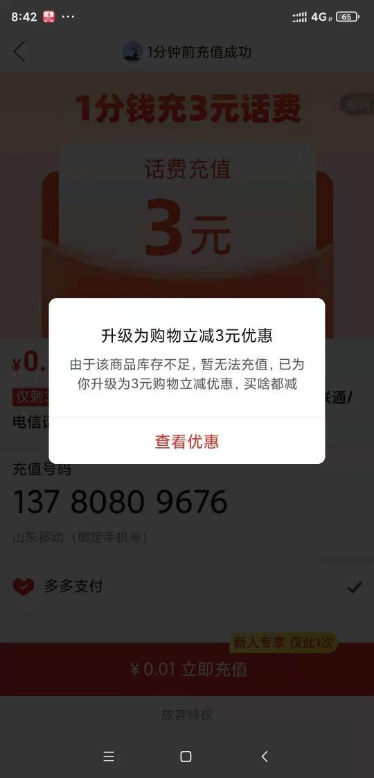 1分钱充3元话费也是划算的,待我确认之后又提示,由于该商品库存不足,无法为我充值,已经给我升级为购物立减3元……