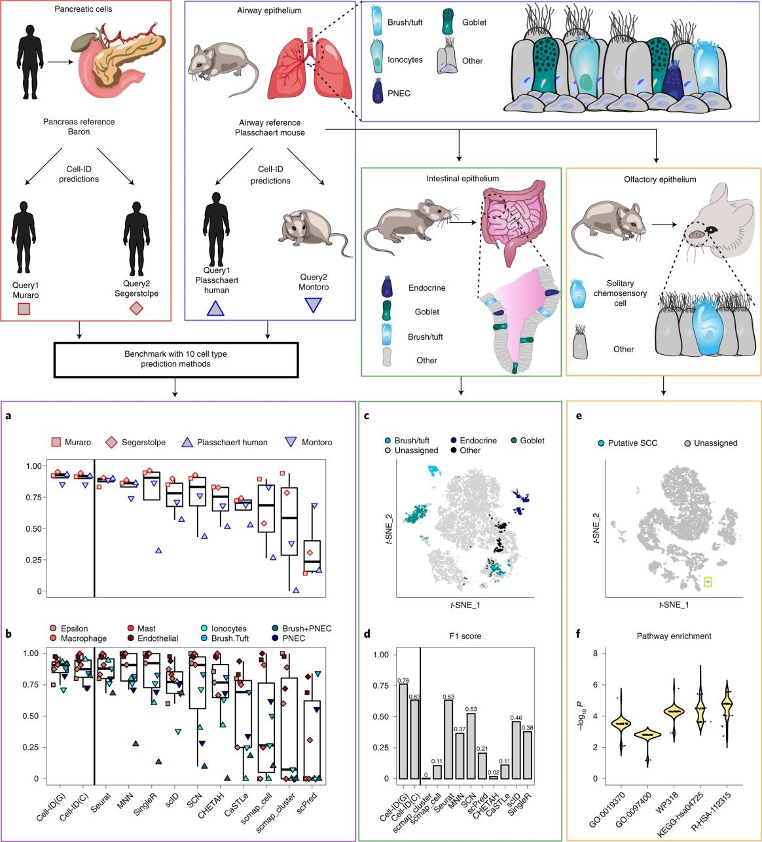 随后,研究团队评估了Cell-ID在来自同一组织的独立scRNA数据集中识别类似细胞类型的能力。研究人员分析了来自多个供体和不同测序技术产生的人类胰岛和人类及小鼠气道上皮细胞数据集(图3),结果显示,Cell-ID的整体性能与已经发表的方法相当(图3a)。