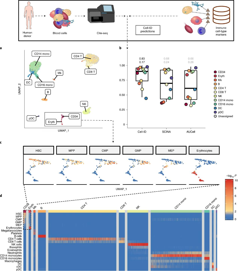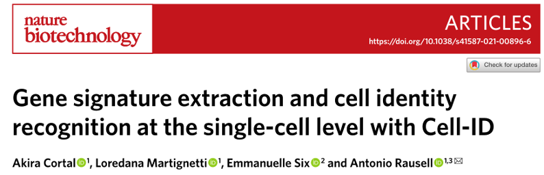 Cortal A, Martignetti L, Six E, Rausell A. Gene signature extraction and cell identity recognition at the single-cell level with Cell-ID [published online ahead of print, 2021 Apr 29].Nat Biotechnol.2021;10.1038/s41587-021-00896-6.