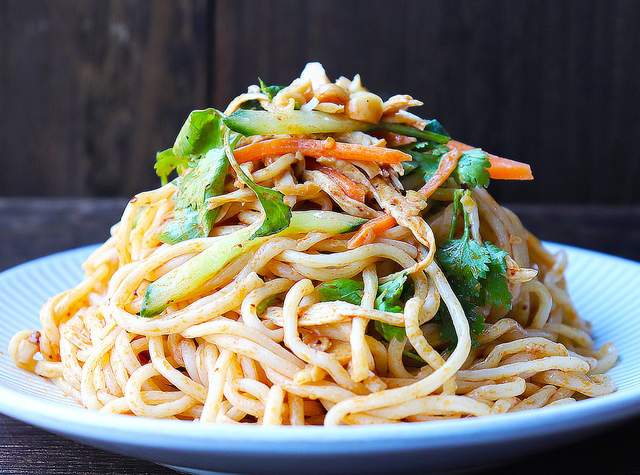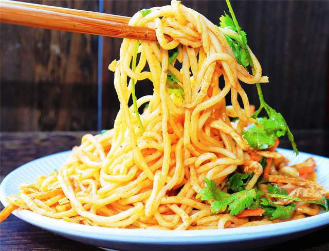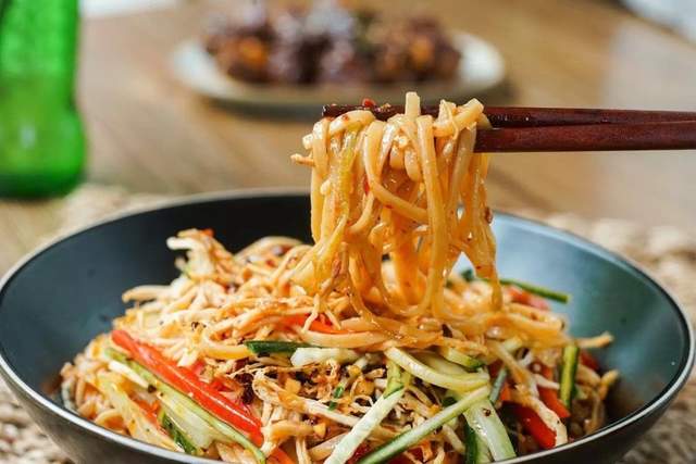 出品:煮好面150克到200克左右,黄瓜丝20克、鸡丝30克、酱汁110克、红油(带芝麻)30克、花生碎10克、葱花少许。