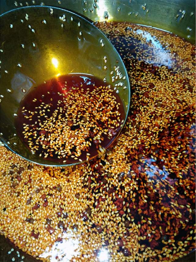 5、油温再次烧到195度左右,泼辣椒面,需不停地搅动,防止辣椒糊掉,油泼完后密封保存,12小时后即可使用。