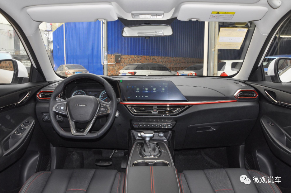 内饰部分采用长安家族设计语言,可以选装10.25英寸的液晶仪表盘,再加上10.25英寸的中控液晶大屏,有效的提升了科技感,中控大屏下方为回形样式空调出风口,再往下为实体按钮整体摆布。平底样式方向盘非常运动,游艇样式打扮更为时尚,黑色打底,红色的细长装饰条点缀,显得更加运动。门板上有皮革覆盖,加上银色镀铬装饰条点缀,使车内档次感得到提升。