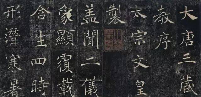褚遂良《雁塔圣教序》,立于永徽四年,分“序”和“记”。在褚遂良笔下,“序”比较安和稳重,“记”用笔较恣肆。其线条,最突出的特征,轻灵与跳跃感。强调笔画的轻重变化,用孙过庭的话讲是“变起伏于锋杪”,这六个大字,褚遂良当之无愧。