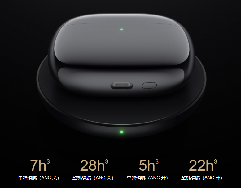 续航方面,这款耳机关闭 ANC 主动降噪时续航 7h,开启后续航 5h。结合充电盒使用,关闭降噪后整机续航 28h,开启降噪后续航 22h。这款充电盒采用 Type-C 接口,支持 Qi 无线充电协议,为耳机充满电仅需 35 分钟。