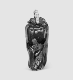 这是张黑白照片,照片上是一枚以总重达二十五克拉的钻石镶嵌而成的翡翠青椒吊坠。
