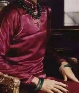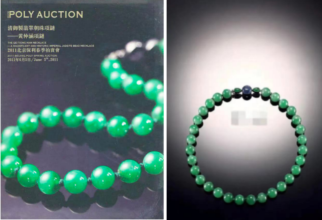再看一张照片,这条翡翠珠链来自于逊帝溥仪手中的一串翡翠朝珠,20世纪初,“翡翠大王”铁宝亭将这串朝珠改制成两串翡翠珠链,出售给了“印尼糖王”黄仲涵。
