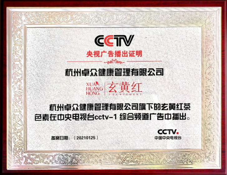 4月28日,玄黄红茶色素的广告强势登陆央视一套,并授予播出证明证书以及2021荣誉展播推荐品牌!