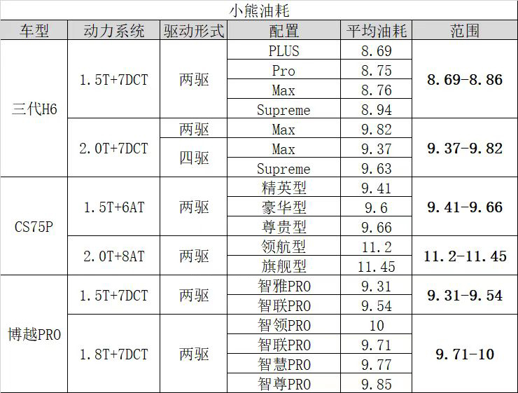 2、2.0T车型:第三代哈弗H6约为9.6L,长安CS75 PLUS约为11.3L,吉利博越PRO约为9.8L,第三代哈弗H6依旧稳赢。