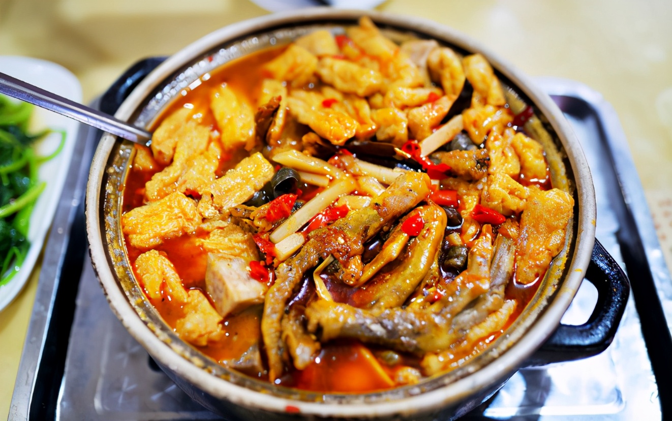 店里主打的是各种肥螺煲,有肥螺鸭脚煲、肥螺羊蹄煲、肥螺猪脚煲等等,味道其实都是差不多的,只是里面的食材不同。点了一份肥螺全家福煲,端上来的时候傻眼了,因为实在是太大一煲了。里面的料也是十足,所谓“全家福”,顾名思义就是田螺、鸭脚、猪脚、羊蹄、豆腐条、芋头、腐竹、酸笋啥都有。