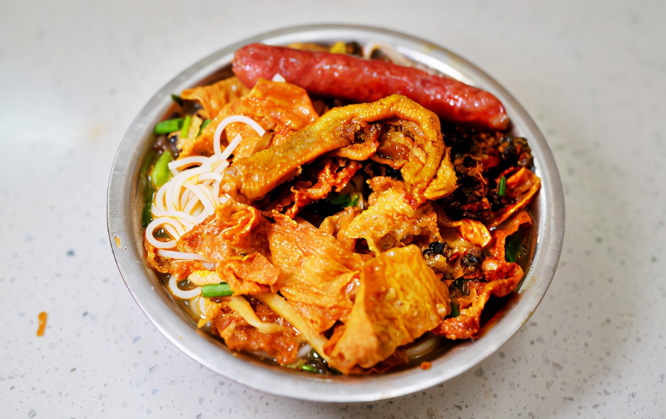 加了四、五种卤菜,加起来一碗粉差不多三十元的样子,拍完照才发现底下的粉几乎被卤菜完全遮挡住了。螺蛳粉的汤料是由螺蛳、山奈、八角、肉桂等多种香料配制而成,有些人吃过螺蛳粉后会感到奇怪为什么一颗螺蛳也没有吃到,实际上螺蛳主要就是拿来熬汤头的,想吃螺蛳肉最好还是额外加螺蛳肉。