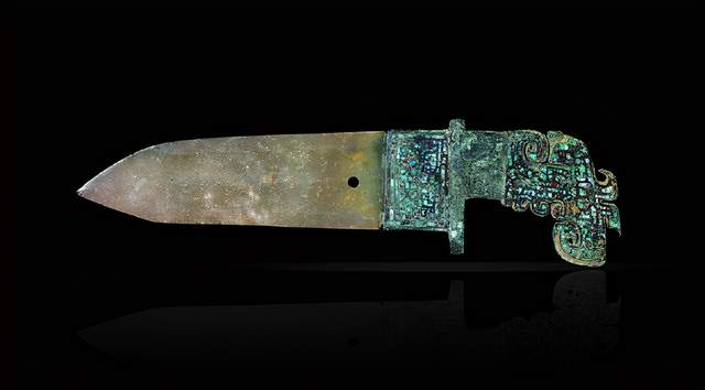 殷墟妇好墓出土的绿松石镶嵌的青铜剑和青铜钺