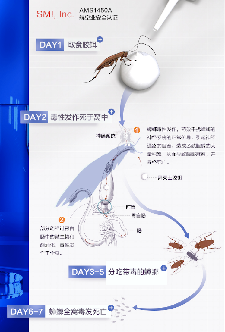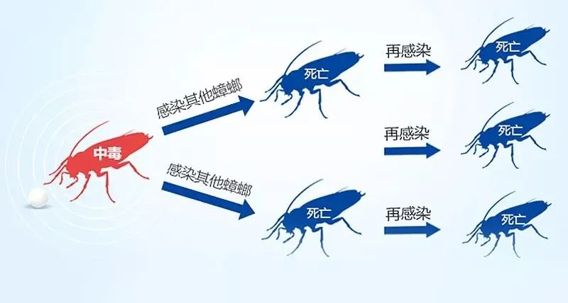 而中毒死掉的蟑螂尸体也有毒,谁吃谁中毒。窝里其他的大小蟑螂分吃了后,就会中毒,再死-再被吃……如此循环,这一窝蟑螂就都死光光了。