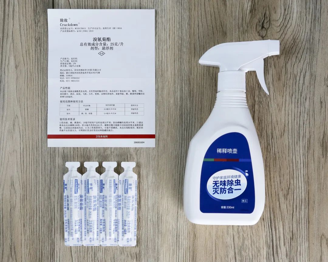 除敌喷剂里有4支5ml的浓缩液,还附送一个喷雾瓶。每支5ml的浓缩液按照说明书兑水稀释后喷洒。